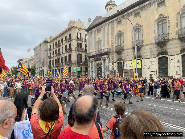 오후 5시 14분부터 Pla de palau에서 행진이 시작될 거라고 했다. 왜 하필 14분? 했더니 17시 14분. 1714년을 기념하기 위한 거란다. 30분쯤 일찍 도착한 우리는 마침 행진을 준비하던 무리가 신명나게 북을 치며 공연하는 것을 볼 수 있었다.