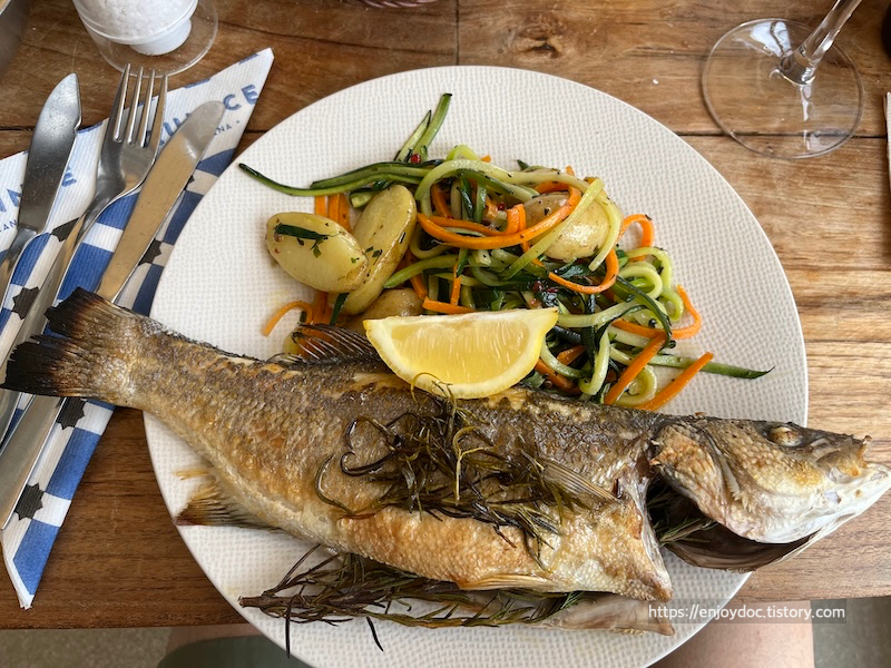 벌써 삼박사일 여행의 마지막 날이다. 숙소를 나서 알쿠디아 시내와 성벽을 좀 걸은 후 알쿠디아 항구로 이동해 해변을 걸었다. 해변의 휴양도시 느낌은 그리 새롭지 않았지만, 따뜻한 햇볕이 쬐는 날에 파라솔 그늘 아래에서 바다를 보며 맥주를 마시는건 아직도 질리지 않고 여전히 좋다. 운전 때문에 맥주를 마실 수는 없었으므로 탄산수로 아쉬운 마음을 대신했다.