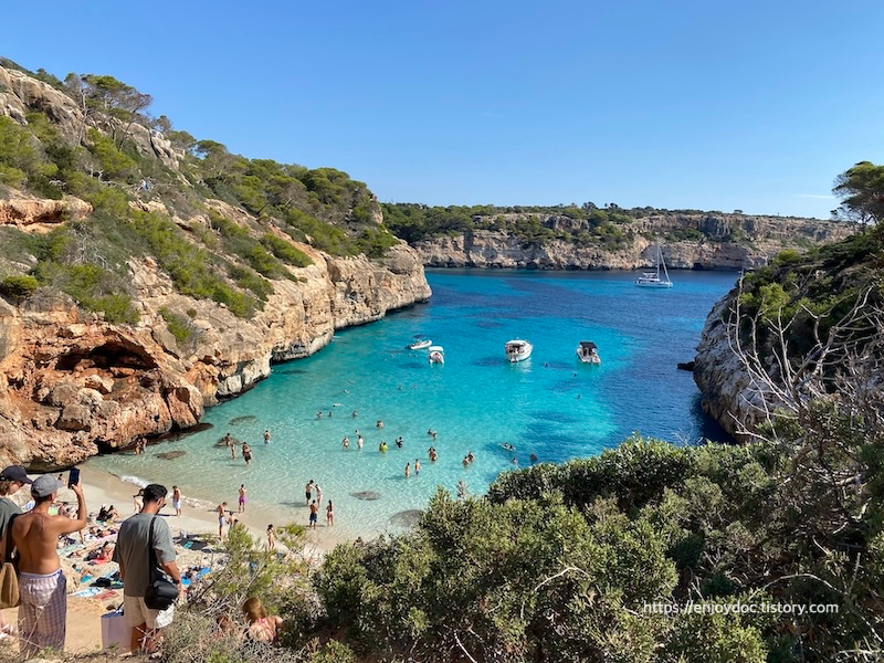 Calo des moro는 아름다운 해변가로 유명하다(고 한다). 그래서 어떤 계기로 유명해졌는지를 잠깐 찾아봤지만, 특별히 영화에 등장했다던지 하는 얘기를 찾지는 못했다(유명 사진 작가의 사진이 있다는 얘길 들은 것 같다). 아무튼 마요르카도 제주도같이 고속도로가 사방팔방으로 되있는게 아니라 루트가 몇개 뿐이기 때문에, 동남쪽에 있는 칼로 데스 모로에 갔다가 동북쪽에 있는 알쿠디아로 가려면 원점에 돌아와서 다시 가는 형태로 이동을 해야했다. 한시간정도 운전을 해서 칼로 데스 모로 근처 주차장에 도착했고, 공영주차장(정식 주차장 보다는 공터에 가깝다)이 해변과 거리가 있어 이십분정도 걸었다. 시월이 되었는데도 날이 따뜻해서 해변에 가는 사람들이 많이 보였다.
